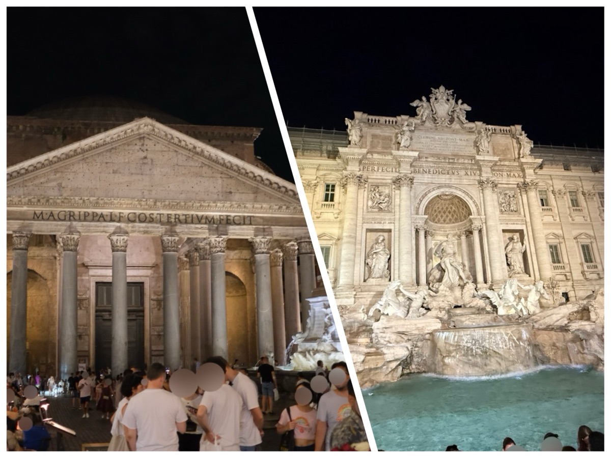 ローマの夜を散策し、ライトアップされたパンテオンとトレビの泉を訪れた体験記。昼間とは異なる雰囲気や混雑状況、夜でも楽しめる観光の魅力を実体験ベースで紹介します。夜のローマ観光を検討している方におすすめの内容です。 -