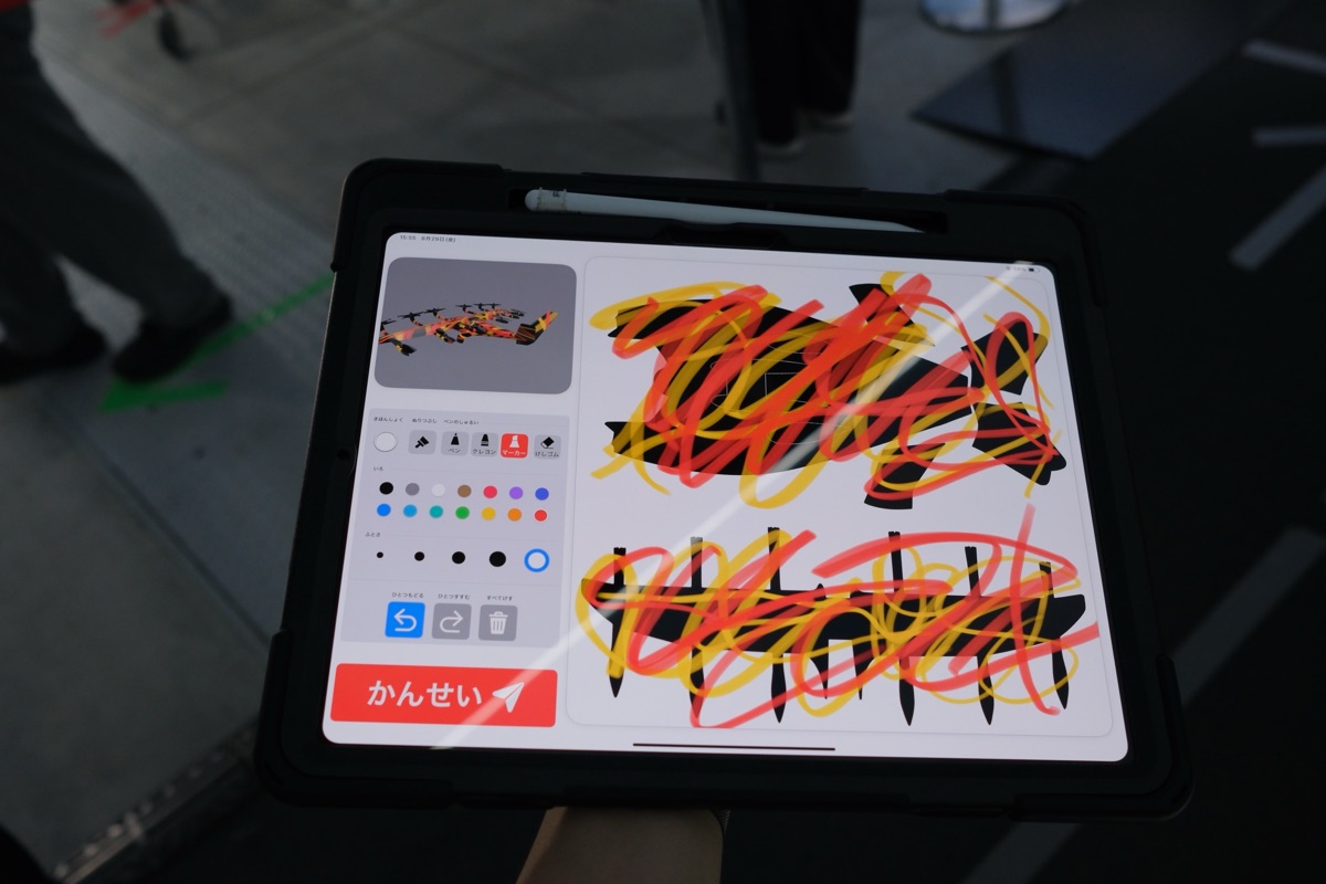 イマーシブシアター体験の前には、空飛ぶクルマに色を塗ることができます。パーツごとに色を塗り分けてもつまらないと思い、何か柄ものの機体ができないかなと思って塗ってみたら…