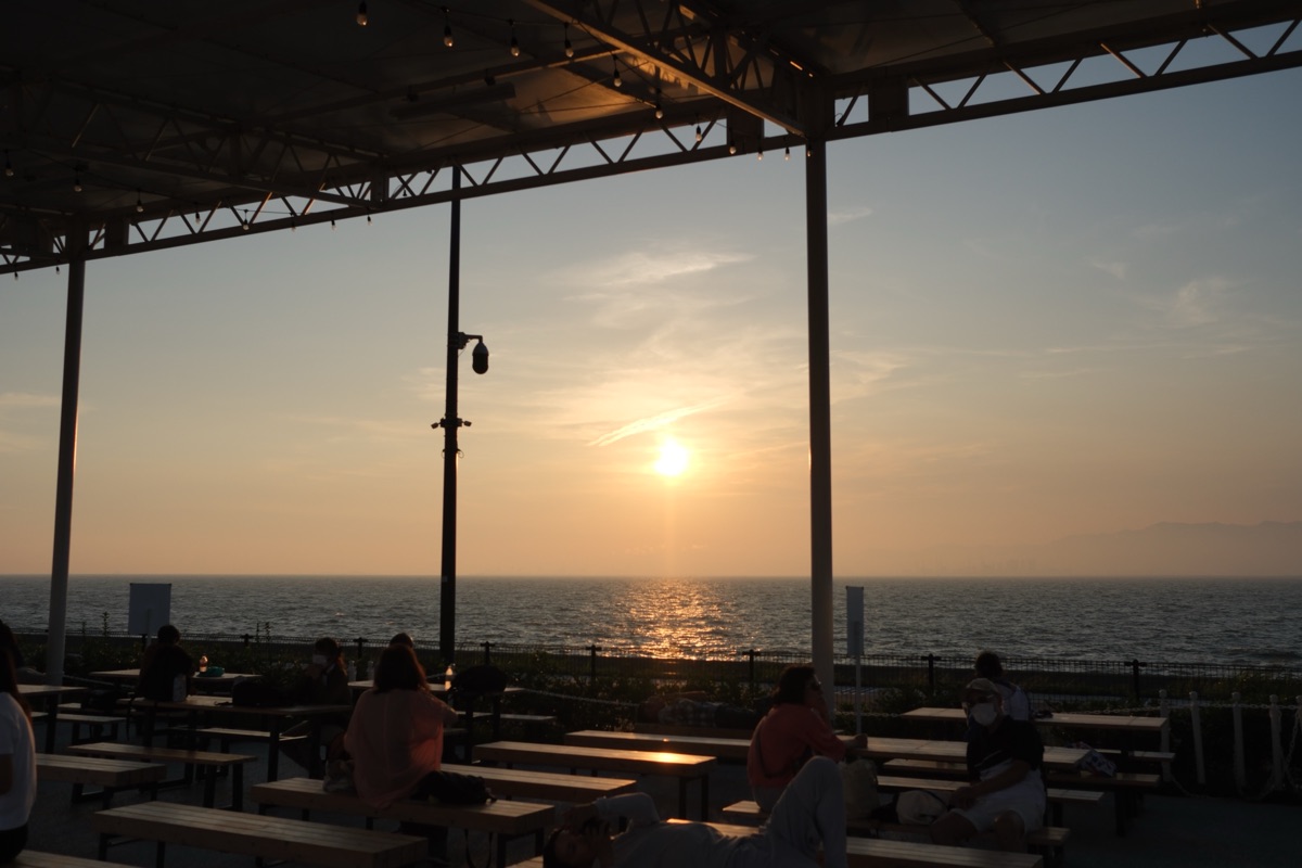 空飛ぶクルマ ステーションを見学した後、再び会場を散策しました。向かったのは西ゲートの先です。フューチャーライフゾーンのいちばん海側は休憩所になっており、夕日が非常に美しく眺められました。