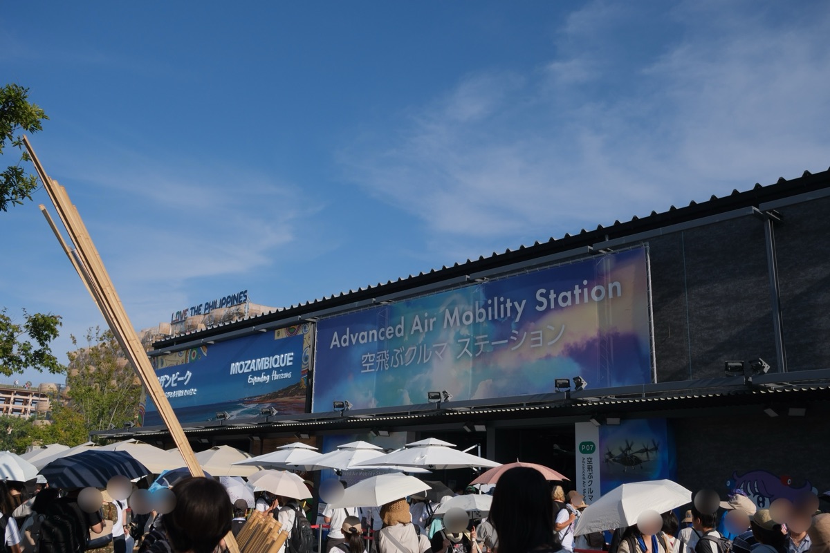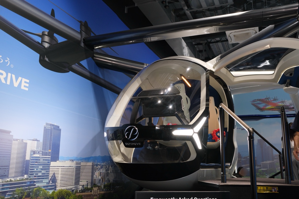 空飛ぶクルマ ステーションは、撤退国のスペースを活用し、万博協会が設置したパビリオンです。入ってすぐの場所に展示してある機体はスカイドライブ社のものです。