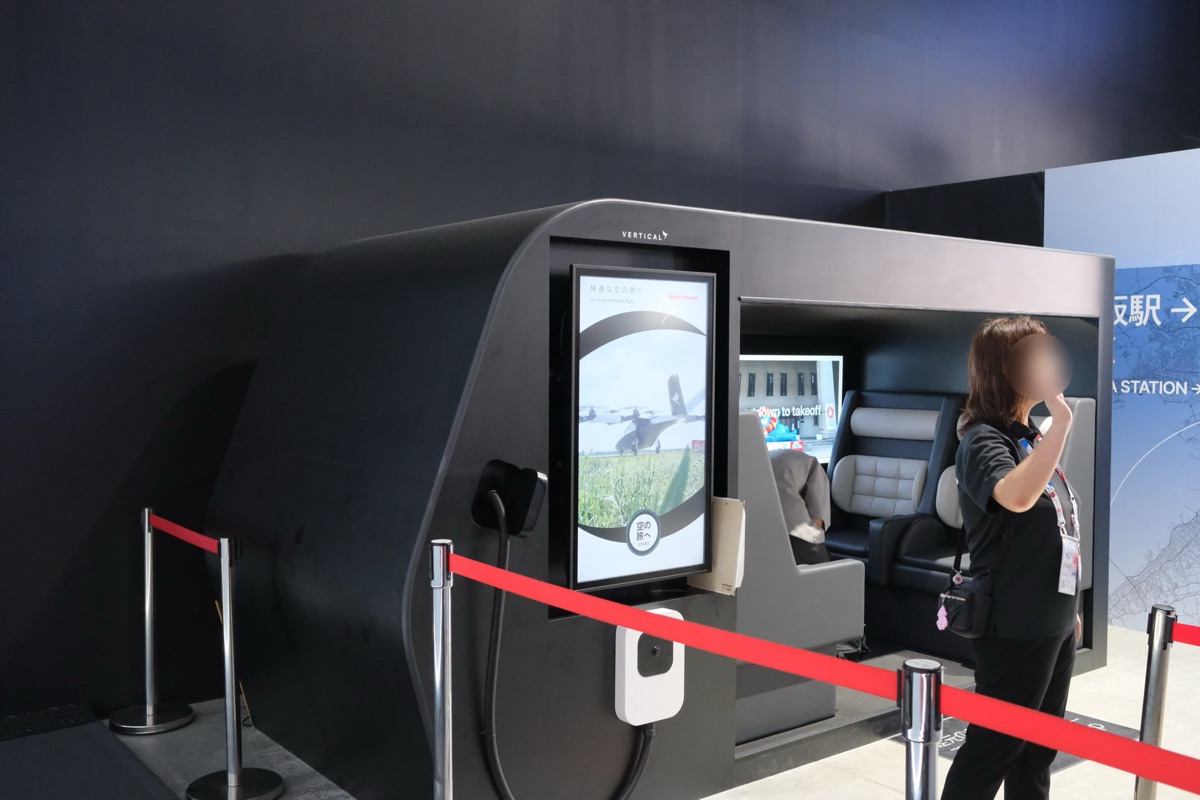 運転席も見学できました。非常に未来的です。次は丸紅による展示で、こちらは英国のVertical社製VX4のキャビンを疑似体験できる展示です。