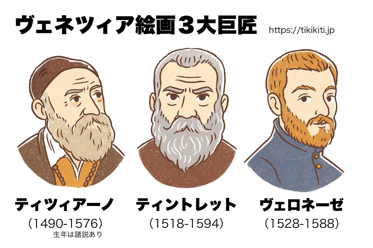 その3人とは、ティツィアーノ・ヴェチェッリオ(Tiziano Vecellio)、ティントレット(本名はヤーコポ・ロブスティ/Jacopo Robusti)、そしてパオロ・ヴェロネーゼ(Paolo Veronese)です。