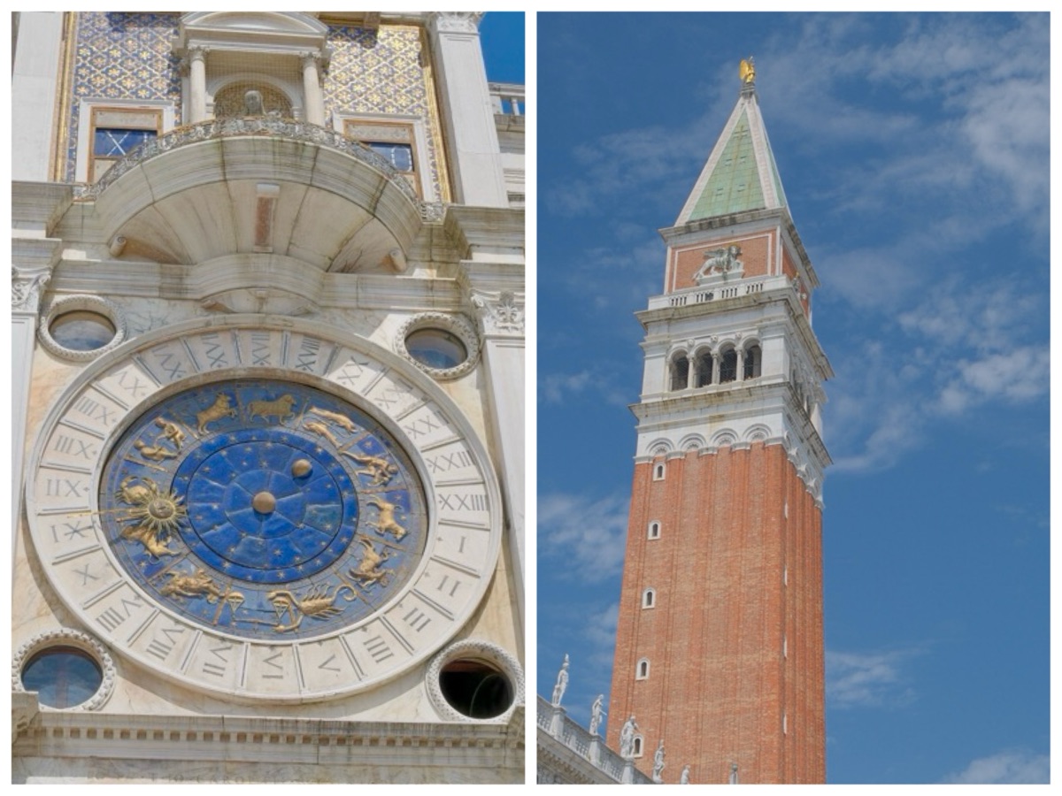 さまざまな装飾が重なり合った、とても見応えのある時計塔です。なお、1797年にヴェネツィアがフランスに占領されるまでは、現在の聖母子像ではなく、ヴェネツィア共和国の国家元首であるドージェの像が置かれていたそうです。